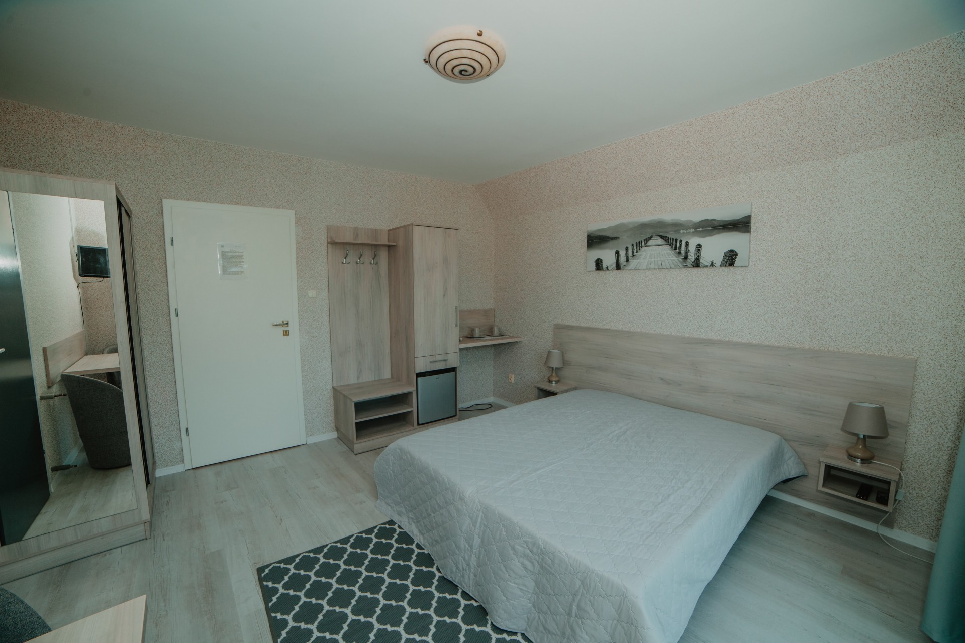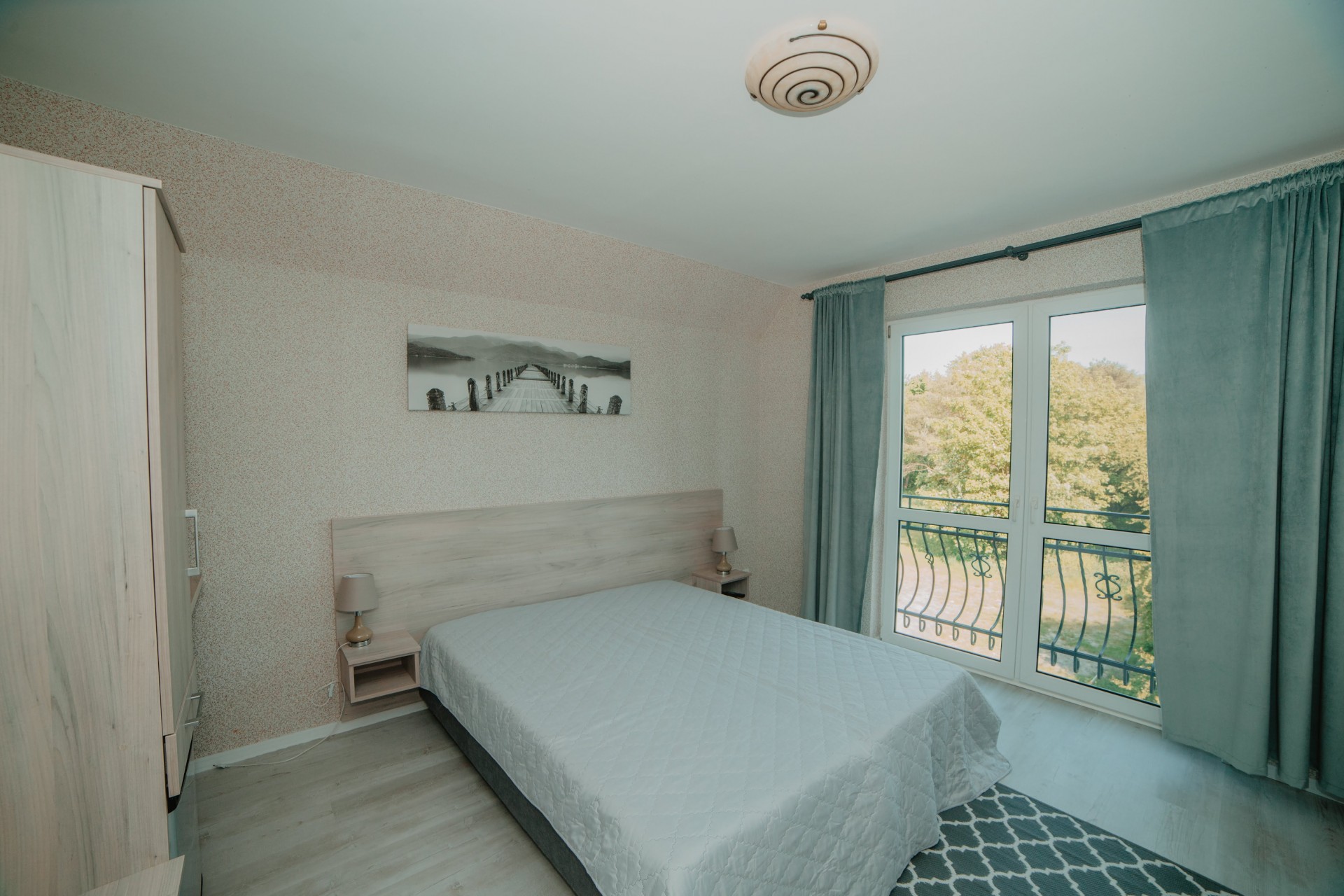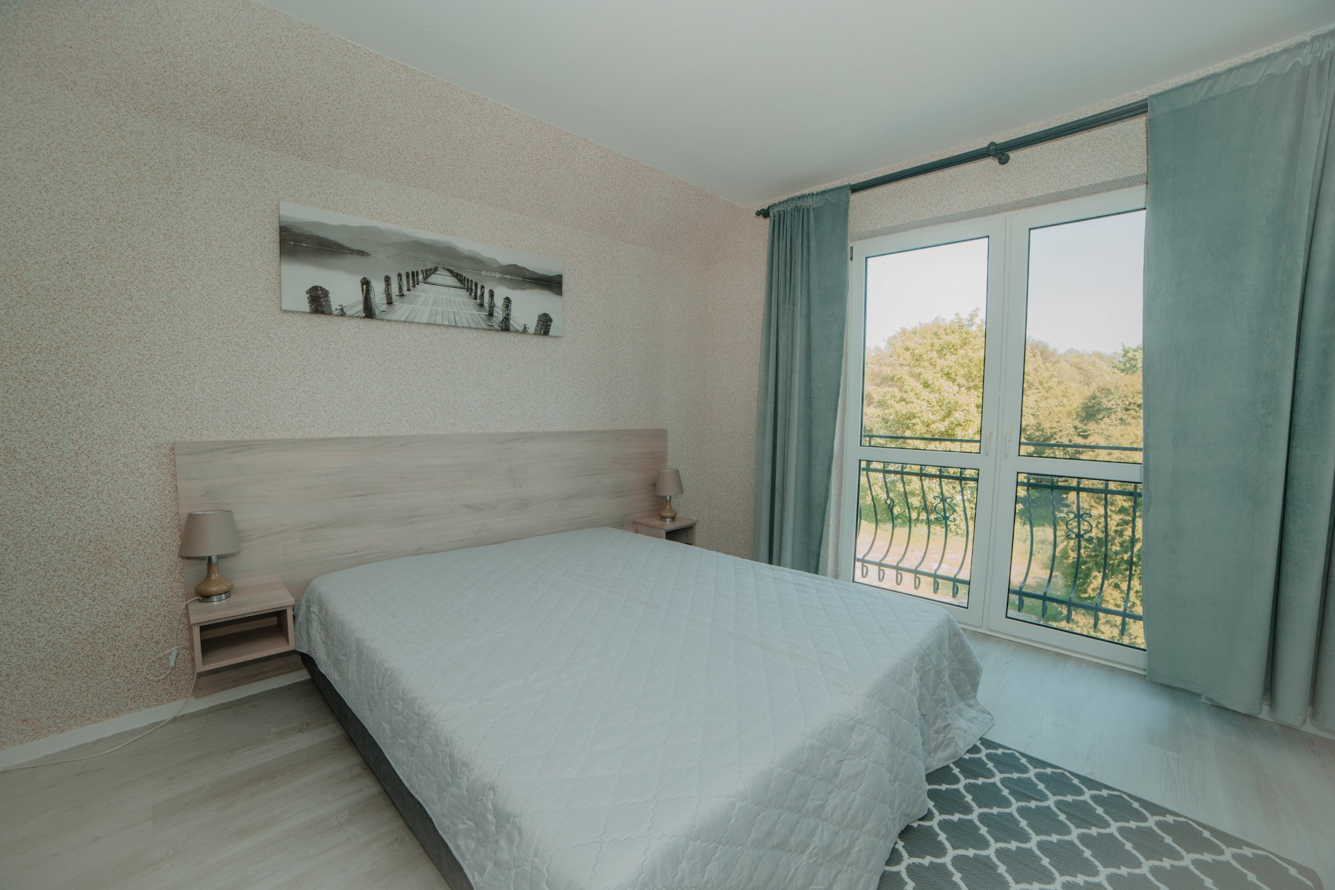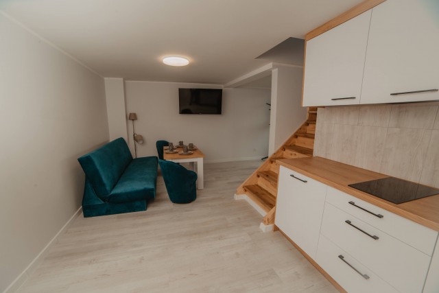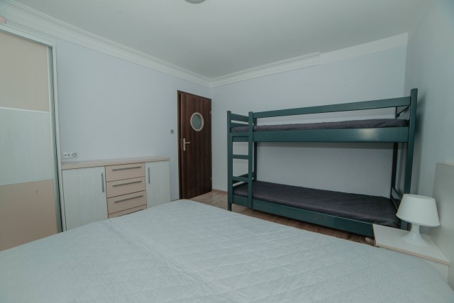 Rodzinny apartament z oddzielną sypialnią (łóżko małżeńskie + łóżko piętrowe), prywatną łazienką oraz przestronnym salonem z aneksem kuchennym i balkonem. Doskonały wybór dla rodzin z dziećmi.Apartament nr 2