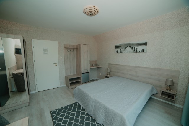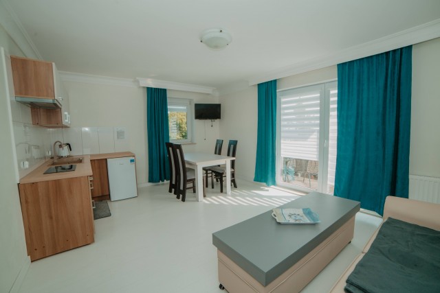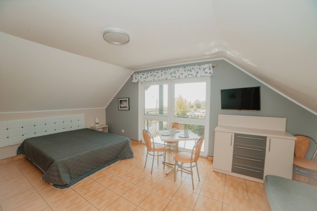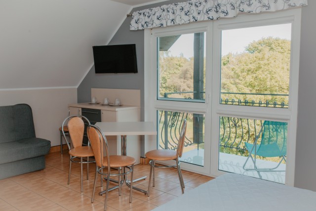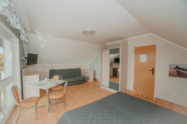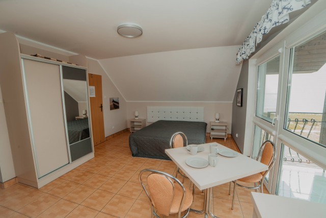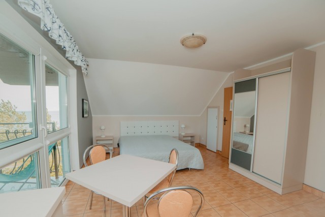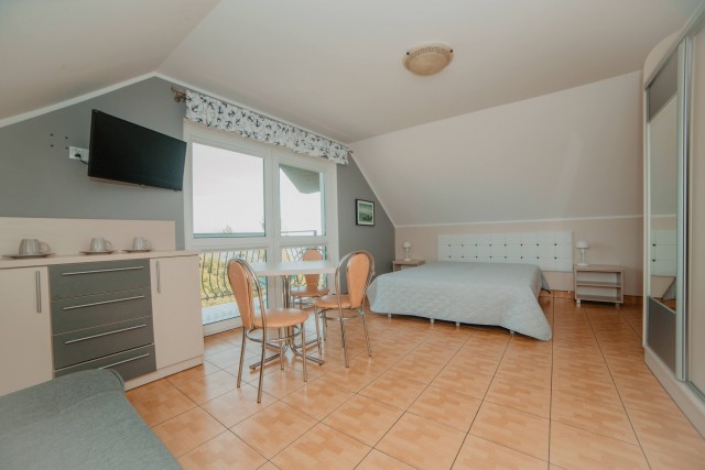 Przestronny pokój z balkonem i prywatną łazienką. W wyposażeniu: 1 łóżko podwójne oraz rozkładana wersalka – idealny dla rodziny lub trójki dorosłych.Pokoje typu studio z aneksem kuchennym i łazienką (2 dostępne)