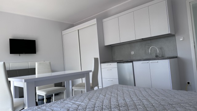 Komfortowe, funkcjonalne studia z aneksem kuchennym, prywatną łazienką oraz częścią wypoczynkową.